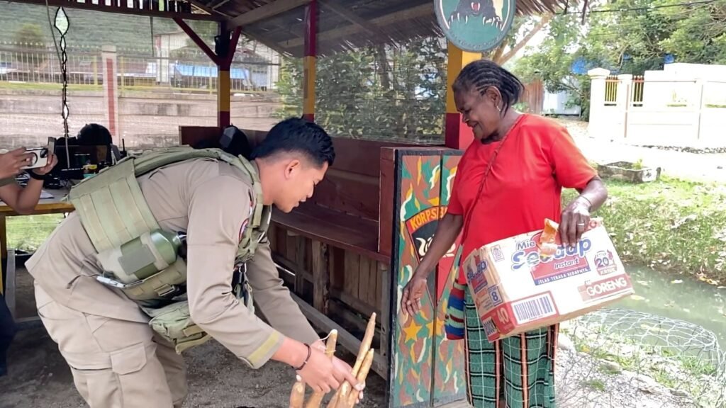 Pegunungan Bintang, 9 Maret 2025 – Momen penuh kehangatan dan kebersamaan terjadi di Distrik Oksibil, Kabupaten Pegunungan Bintang, Papua Pegunungan. Seorang Mama Papua dengan penuh ketulusan berbagi hasil panennya dengan personel Operasi Damai Cartenz 2025, menunjukkan kuatnya ikatan sosial antara masyarakat dan aparat keamanan.