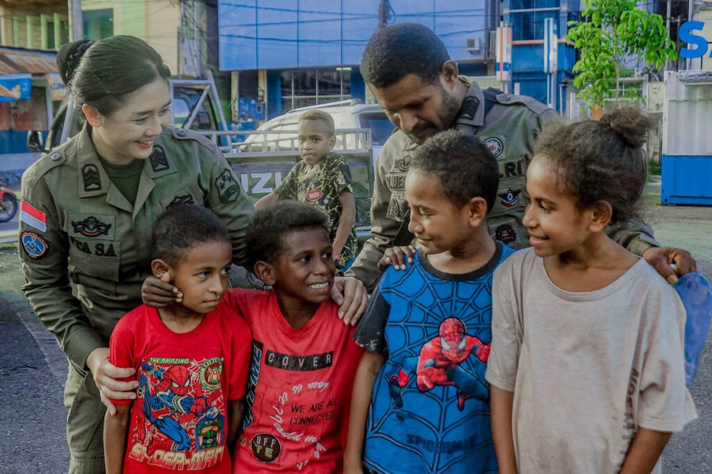 Dengan senyum hangat, mereka berinteraksi dengan mama-mama dan anak-anak Papua, menciptakan suasana penuh keakraban dan persahabatan.
